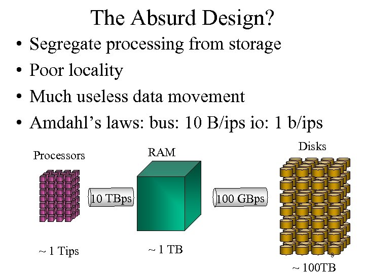The Absurd Design? • • Segregate processing from storage Poor locality Much useless data movement Amdahl’s laws: bus: 10 B/ips io: 1 b/ips Processors 10 TBps ~ 1 Tips Disks RAM 100 GBps ~ 1 TB 8 ~ 100 TB