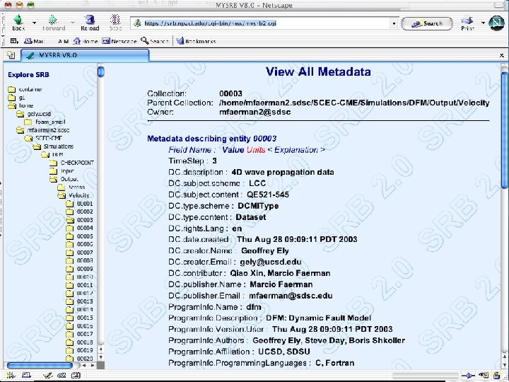 Generic Infrastructure • SDSC developed the Storage Resource Broker (SRB) to support access to distributed data • Effort started in 1996 as a DARPA funded project • Now support over 30 national/international projects • Development team of 12 staff is led by • Michael Wan, data management systems • Arcot Rajasekar , information management systems