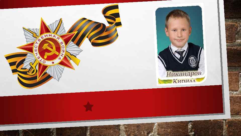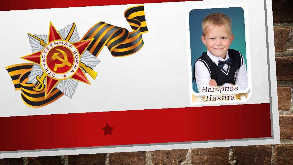 Мой прадедушка, Нагорнов Аркадий Фёдорович родился в селе Кириково Горьковской области. С 23 марта 1943 года служил в Рабоче-Крестьянской Красной Армии. Он был стрелком 6 -ой Стрелковой роты, в звании лейтенант. ПО ПРИКАЗУ от имени Президиума Верховного Совета Союза ССР от 17. 06. 1945 был награжден медалью «За отвагу» . Из выписки приказа: «В боях на подступах к городу Бреслааль в районе населенного пункта Крептау проявил мужество и геройство. Не смотря на сильный огонь противника, первым ворвался в траншеи противника и, завязав неравный гранатный бой, в результате которого лично в схватке уничтожил 3 немецких солдат. Сам был ранен и контужен 10 февраля 1945 года» . 06. 11. 1985 году он был награжден Орденом Отечественной войны I степени. Нагорнов Аркадий Федорович (21. 07. 1925 – 20. 09. 1986)