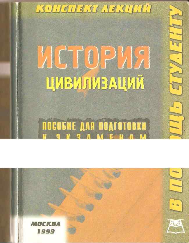 История цивилизаций (конспект лекций). - М. : "ИЗДАТЕЛЬСТВО ПРИОР", 1999. - 192 С. ISBN 5 -7990 -0387 -Х Автор-составитель: Широкова И. Г. Настоящим изданием мы продолжаем серию "В помощь студенту", . в. которую входят лучшие конспекты лекций по дисциплинам, изучаемым в гуманитарных вузах. Используя данную книгу при подготовке к сдаче экзамена, студенты смогут в предельно сжатые сроки систематизировать и конкретизировать знания, приобретенные в процессе изучения этой дисциплины; сосредоточить свое внимание на основных понятиях, их признаках и особенностях; , сформулировать примерную структуру (план) ответов на возможные экзаменационные вопросы. . ДАННАЯ КНИГА НЕ ЯВЛЯЕТСЯ АЛЬТЕРНАТИВОЙ УЧЕБНИКАМ ДЛЯ ПОЛУЧЕНИЯ ФУНДАМЕНТАЛЬНЫХ ЗНАНИЙ, НО СЛУЖИТ пособием для успешной сдачи экзаменов. Редактор А. Г. Буланова^ Корректор Д. М. Кирсанова Верстка Н. В. Пронина "Издательство ПРИОР" Москва, Воронцовский пер. , 5/7 Телефоны: 964 -4200, 964 -49 -00 Издательская лицензия ЛР № 065184 Гигиеническое заключение № 77. 99. 2. 953. 0. 5615. 9. 99 от 16. 09. 99 Издание осуществлено совместно с издательством Приоритет Подписано в печать^/И. 9 Э • Заказ AIFI-. ТИРАЖ 3000 • ОТПЕЧАТАНО В ПОДОЛЬСКОМ ФИЛИАЛЕ ЧПК 142110, ПОДОЛЬСК, УЛ. КИРОВА, 25. ISBN 5 -7990 -0387 -Х "ИЗДАТЕЛЬСТВО ПРИОР", 1999 I