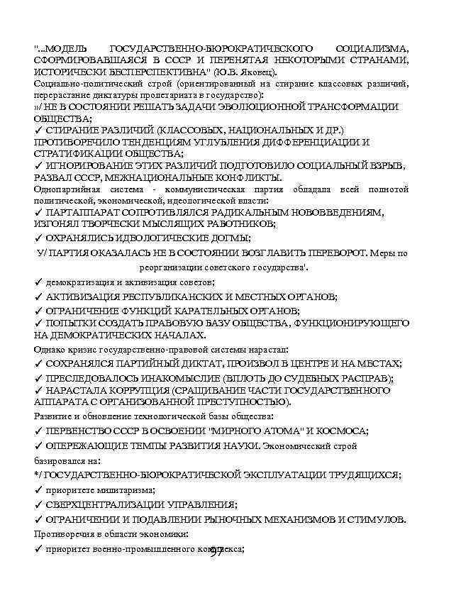 ". . . МОДЕЛЬ ГОСУДАРСТВЕННО-БЮРОКРАТИЧЕСКОГО СОЦИАЛИЗМА, СФОРМИРОВАВШАЯСЯ В СССР И ПЕРЕНЯТАЯ НЕКОТОРЫМИ СТРАНАМИ, ИСТОРИЧЕСКИ БЕСПЕРСПЕКТИВНА" (Ю. В. Яковец). Социально-политический строй (ориентированный на стирание классовых различий, перерастание диктатуры пролетариата в государство): » / НЕ В СОСТОЯНИИ РЕШАТЬ ЗАДАЧИ ЭВОЛЮЦИОННОЙ ТРАНСФОРМАЦИИ ОБЩЕСТВА; ✓ СТИРАНИЕ РАЗЛИЧИЙ (КЛАССОВЫХ, НАЦИОНАЛЬНЫХ И ДР. ) ПРОТИВОРЕЧИЛО ТЕНДЕНЦИЯМ УГЛУБЛЕНИЯ ДИФФЕРЕНЦИАЦИИ И СТРАТИФИКАЦИИ ОБЩЕСТВА; ✓ ИГНОРИРОВАНИЕ ЭТИХ РАЗЛИЧИЙ ПОДГОТОВИЛО СОЦИАЛЬНЫЙ ВЗРЫВ, РАЗВАЛ СССР, МЕЖНАЦИОНАЛЬНЫЕ КОНФЛИКТЫ. Однопартийная система - коммунистическая партия обладала всей полнотой политической, экономической, идеологической власти: ✓ ПАРТАППАРАТ СОПРОТИВЛЯЛСЯ РАДИКАЛЬНЫМ НОВОВВЕДЕНИЯМ, ИЗГОНЯЛ ТВОРЧЕСКИ МЫСЛЯЩИХ РАБОТНИКОВ; ✓ ОХРАНЯЛИСЬ ИДЕОЛОГИЧЕСКИЕ ДОГМЫ; У/ ПАРТИЯ ОКАЗАЛАСЬ НЕ В СОСТОЯНИИ ВОЗГЛАВИТЬ ПЕРЕВОРОТ. Меры по реорганизации советского государства'. ✓ демократизация и активизация советов; ✓ АКТИВИЗАЦИЯ РЕСПУБЛИКАНСКИХ И МЕСТНЫХ ОРГАНОВ; ✓ ОГРАНИЧЕНИЕ ФУНКЦИЙ КАРАТЕЛЬНЫХ ОРГАНОВ; ✓ ПОПЫТКИ СОЗДАТЬ ПРАВОВУЮ БАЗУ ОБЩЕСТВА, ФУНКЦИОНИРУЮЩЕГО НА ДЕМОКРАТИЧЕСКИХ НАЧАЛАХ. Однако кризис государственно-правовой системы нарастал: ✓ СОХРАНЯЛСЯ ПАРТИЙНЫЙ ДИКТАТ, ПРОИЗВОЛ В ЦЕНТРЕ И НА МЕСТАХ; ✓ ПРЕСЛЕДОВАЛОСЬ ИНАКОМЫСЛИЕ (ВПЛОТЬ ДО СУДЕБНЫХ РАСПРАВ); ✓ НАРАСТАЛА КОРРУПЦИЯ (СРАЩИВАНИЕ ЧАСТИ ГОСУДАРСТВЕННОГО АППАРАТА С ОРГАНИЗОВАННОЙ ПРЕСТУПНОСТЬЮ). Развитие и обновление технологической базы общества: ✓ ПЕРВЕНСТВО СССР В ОСВОЕНИИ "МИРНОГО АТОМА" И КОСМОСА; ✓ ОПЕРЕЖАЮЩИЕ ТЕМПЫ РАЗВИТИЯ НАУКИ. Экономический строй базировался на: */ ГОСУДАРСТВЕННО-БЮРОКРАТИЧЕСКОЙ ЭКСПЛУАТАЦИИ ТРУДЯЩИХСЯ; ✓ приоритете милитаризма; ✓ СВЕРХЦЕНТРАЛИЗАЦИИ УПРАВЛЕНИЯ; ✓ ОГРАНИЧЕНИИ И ПОДАВЛЕНИИ РЫНОЧНЫХ МЕХАНИЗМОВ И СТИМУЛОВ. Противоречия в области экономики: ✓ приоритет военно-промышленного комплекса; 97