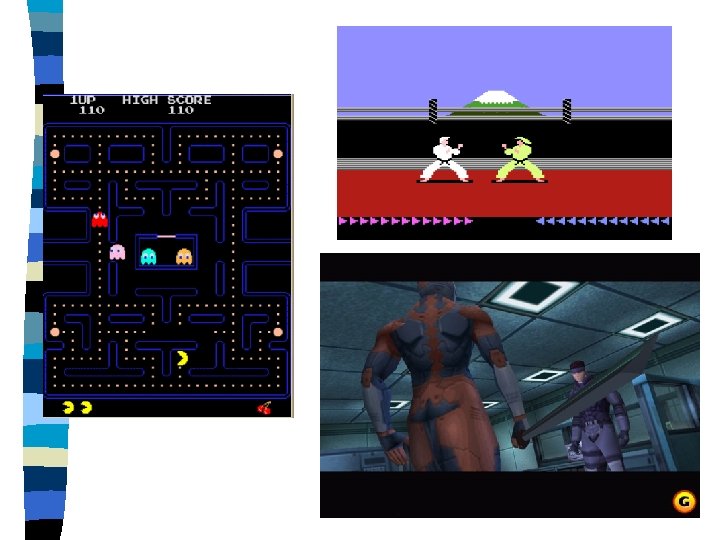 Techniques for in-game storytelling n Text – Signs, notes, books that players can read – Graffiti on the wall n Level settings – Centipede: garden – Monopoly: real estate – RPG: Scene can tell about inhabitant of an area, including the area’s past • Advent children (not a game, but good example)