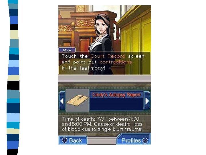– But don’t let it interrupt gameplay (players want to play) • The 7 th Quest (or any FMV game is a good example of FMV’s failure because of using it too much)