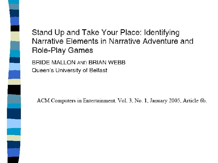 Finding preferred narratives n Exp 1 – 12 students (age 20 -23, played 10 or more games in the past, selected from 70 final year multimedia students ) played 4 adventure games individually. • • Broken Sword 2: The Smoking Mirror Ecstatica 2 Discworld 2: Missing Presumed The Curse of Monkey Island – Analyzed their responses to those games in 5 small group sessions (group size = 3, 2, 2, 3, 2).
