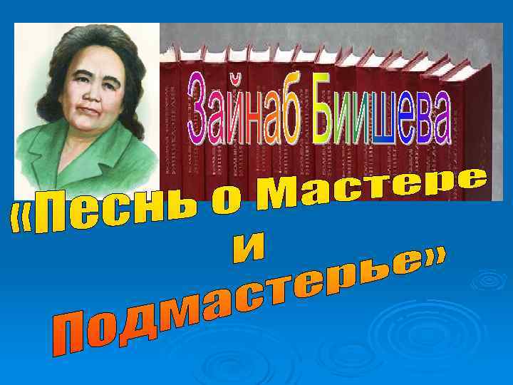 Народный писатель Башкортостана, прозаик, поэт, драматург Зайнаб Абдуловна Биишева родилась 2 января 1908 года в деревне Туембутово Кугарчинского района Башкортостана. § § § § § § К свету. Роман. Уфа, 1970 Волшебный курай. Пьесы, рассказы. Уфа, 1972 курай. Возвращаясь к прошедшему. Очерки, публицистические статьи, воспоминания. Уфа, 1973 Униженные. Роман. Уфа, 1975; Уфа, 1990 У большого Ика. Пробуждение. Роман. Уфа, 1976 Ика. Будем друзьями. Повести, сказка. Уфа, 1978 Емеш. К свету. Роман. Предисл. А. Вахитова. Уфа, 1977 Емеш. Предисл. А. Вахитова. Живые буквы. Уфа, 1989 Раздумья. Восхождение. Повести. Уфа, 1989 Емеш. Роман. Уфа, 1990 Емеш. Старнный человек. Пер. И. Сотникова. Уфа, 1963 (на русск. яз. ) Избранные произведения. В томах. Пер. Ю. Аминова. М. , 1988 (на русск. яз. ) Ю. Аминова. Будем друзьями. Повесть. Пер. А. Леонтьева. Уфа, 1972 (на русск. яз. ) У большого Ика. Емеш. Романы. Пер. А. Гладилина. М. , 1974 (на русск. яз. ) Ика. Емеш. Мастер и подмастерье. Рассказы. Пер. Ю. Аминова. Уфа, 1979 (на русск. яз. ) Ю. Аминова. Униженные. Роман. Пер. Ю. Аминова. М, , 1979; Уфа, 1980 (на русск. яз. ) Ю. Аминова. У большого Ика. Емеш. Романы. Пер. Ю. Аминова. М. , 1983 (на русск. яз. ) Ика. Емеш. Ю. Аминова. У большого Ика. Роман. Пер. Ю. Аминова. М. , 1986; Уфа, 1986 (на русск. яз. ) Ика. Ю. Аминова. Емеш. Роман. Пер. Ю. Аминова. Послесл. Г. Кунафина. Уфа, 1987 (на русск. яз. ) Емеш. Ю. Аминова. Послесл. Г. Кунафина. Любоаь и ненависть. Повести, рассказы. Уфа, 1988 (на русск. яз. ) Униженные. Роман. Казань, 1996