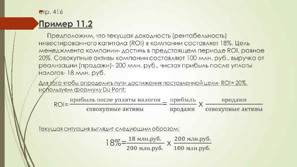 стр. 419 Например, если капитал компании на 50% заемный, а на 50% акционерный (собственный), то обыкновенные акции обладают вдвое большим риском. Если доходность, приносимая заемными средствами, меньше затрат на обслуживание долга, то компания откажется от использования таких заемных средств. Одним из вариантов формулы Du Pont, называемый модифицированной формулой Du Pont, наглядно показывает этот эффект. Формула объединяет показатель доходности инвестированного капитала (ROI) и степень финансового левериджа, определяющего использование заемных средств.