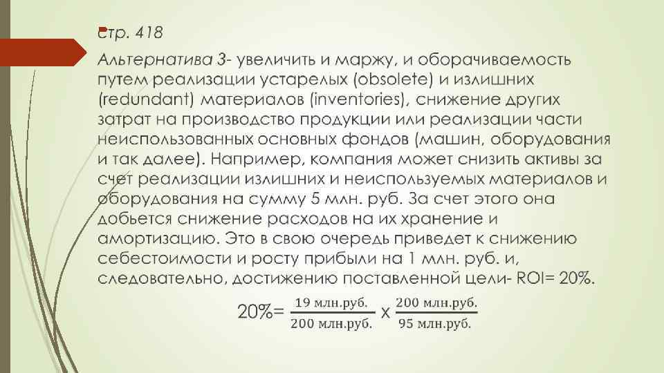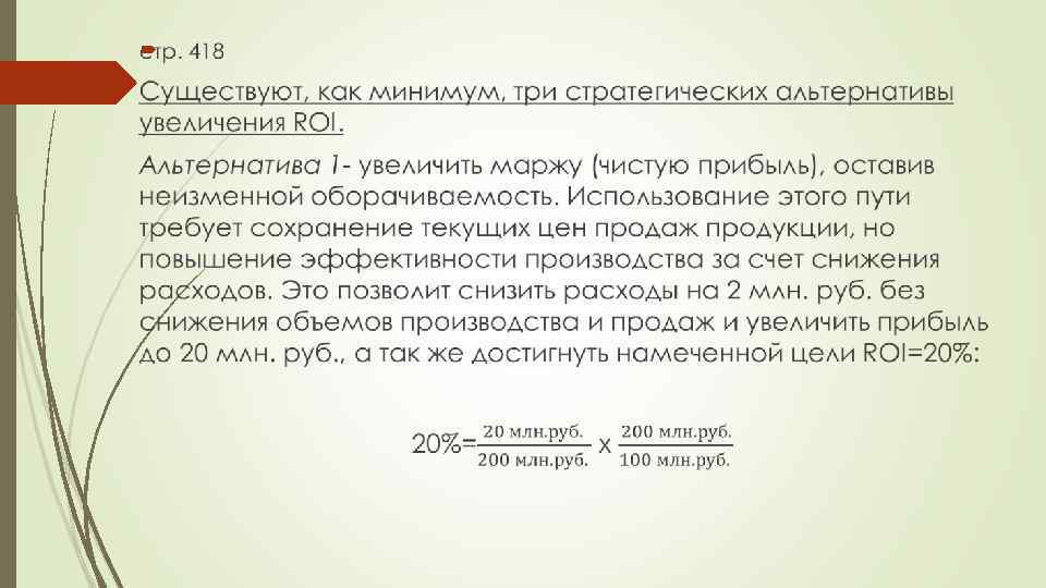 стр. 418 Чрезмерное инвестирование в производственные активы так же отрицательно отражаются на прибыльности производства, как и неоправданные затраты и вложения в себестоимость продукции. Поэтому при тщательном анализе всех трех альтернативных путей менеджмент скорее придет к выводу о целесообразности использования третьего варианта.