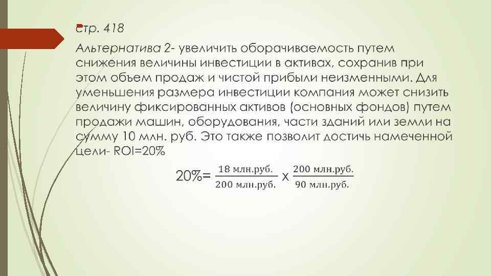 стр. 416 Увеличение оборачиваемости активов может быть достигнуто путем увеличения продаж при постоянных активах или путем снижения активов. К направлениям снижения величины активов традиционно относятся: Реализацию устарелых и излишних видов материалов; Совершенствование методов управления дебиторской задолженностью, переоценку политики и условий кредитования; Выявление и реализацию длительное время не используемых постоянных активов Использование денежной наличности (денежных активов) для оплаты неоплаченных ранее долгов.