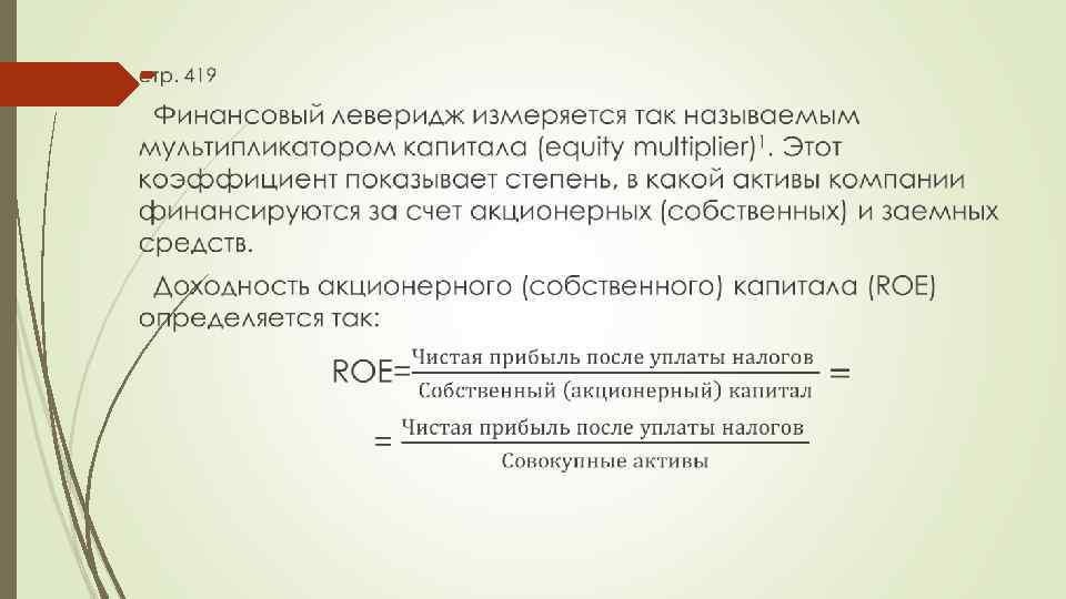 стр. 418 -419 11. 3. Увеличение доходности акционерного капитала путем использования финансового рычага В общем виде высокий результат деятельности менеджмента компании определяется высоким показателем доходности акционерного капитала (ROI). Однако парадокс состоит в том, что даже плохо управляемые компании могут демонстрировать достаточно высокие уровни доходности акционерного капитала. Этого можно достичь, используя заемные средства, которые могут увеличить доходность акционерного (собственного) капитала (return on equity, ROE).