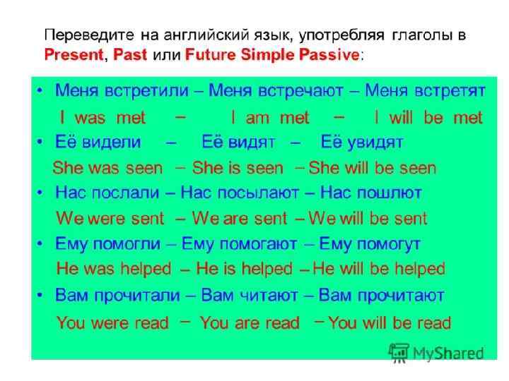 • Образуется как подлежащее To be в нужном времени V 3 (третья форма глагола) By ____ (сделано кем/чем) есть не всегда