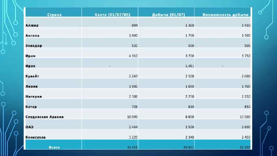 • СТРАНЫ, ВХОДЯЩИЕ В ОПЕК: 1. Венесуэлла 2. Ирак 3. Иран 4. Кувейт 5. Эквадор 6. Саудовская Аравия 7. Катар 8. Ливия 9. ОАЭ 10. Алжир 11. Ангола 12. Нигерия