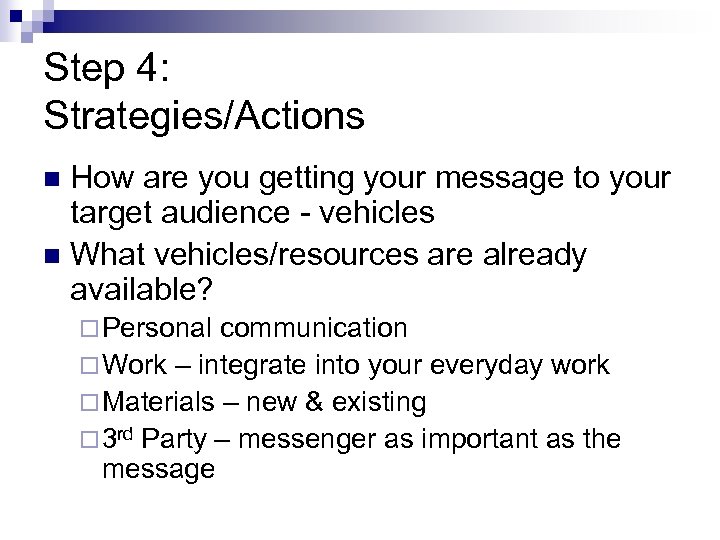 Step 4: Strategies/Actions How are you getting your message to your target audience - vehicles n What vehicles/resources are already available? n ¨ Personal communication ¨ Work – integrate into your everyday work ¨ Materials – new & existing ¨ 3 rd Party – messenger as important as the message