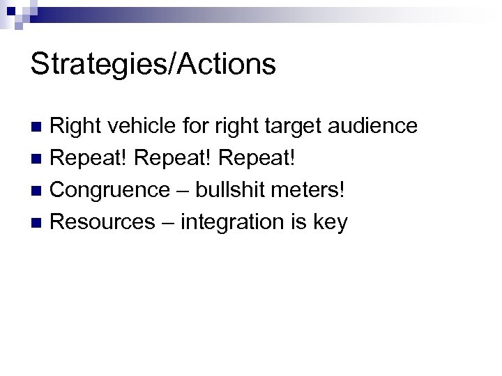 Strategies/Actions Right vehicle for right target audience n Repeat! n Congruence – bullshit meters! n Resources – integration is key n