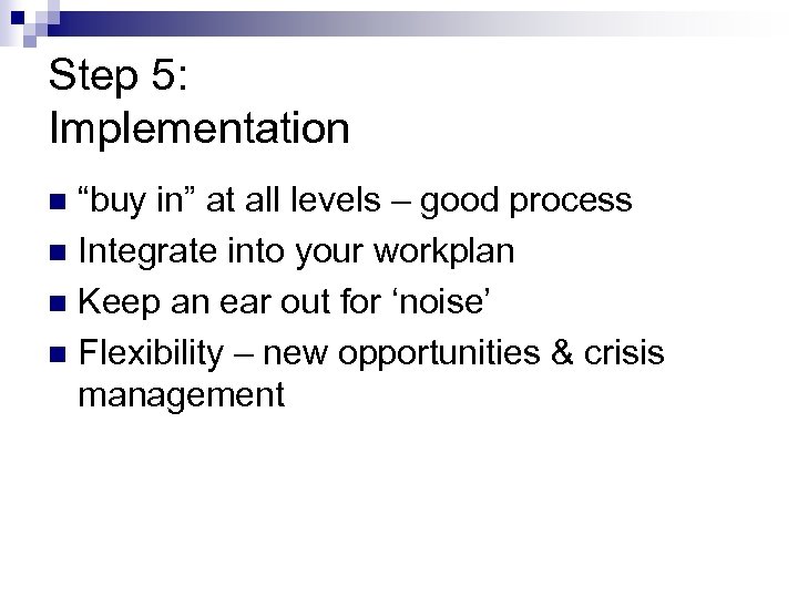 Step 5: Implementation “buy in” at all levels – good process n Integrate into your workplan n Keep an ear out for ‘noise’ n Flexibility – new opportunities & crisis management n