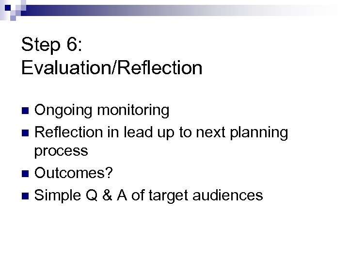 Step 6: Evaluation/Reflection Ongoing monitoring n Reflection in lead up to next planning process n Outcomes? n Simple Q & A of target audiences n