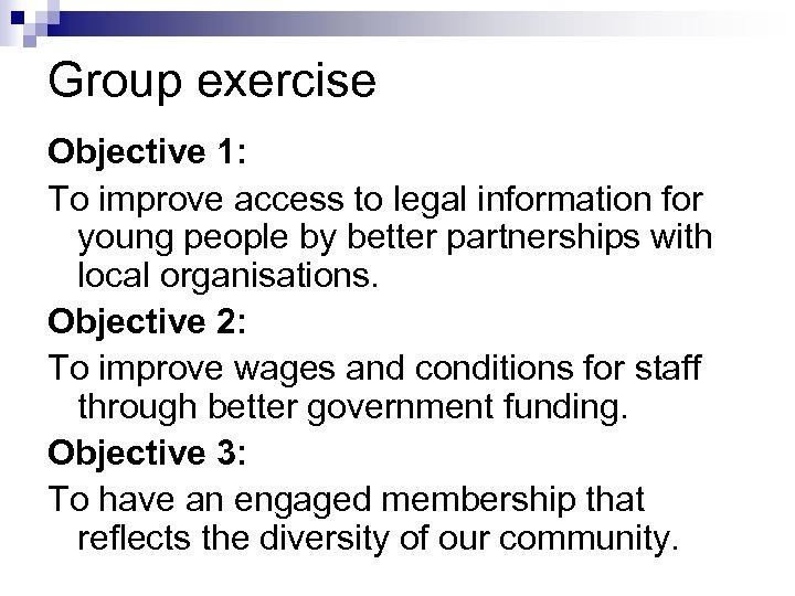 Group exercise Objective 1: To improve access to legal information for young people by better partnerships with local organisations. Objective 2: To improve wages and conditions for staff through better government funding. Objective 3: To have an engaged membership that reflects the diversity of our community.