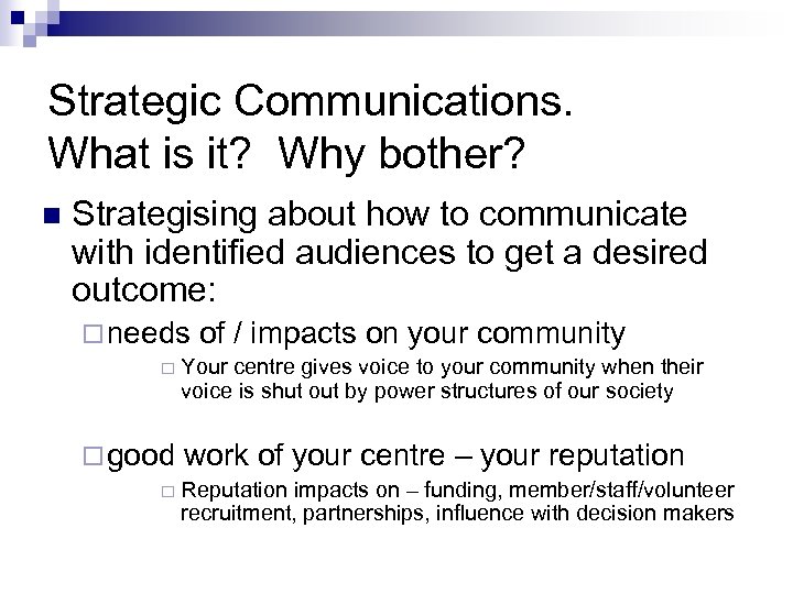 Strategic Communications. What is it? Why bother? n Strategising about how to communicate with identified audiences to get a desired outcome: ¨ needs ¨ ¨ good ¨ of / impacts on your community Your centre gives voice to your community when their voice is shut out by power structures of our society work of your centre – your reputation Reputation impacts on – funding, member/staff/volunteer recruitment, partnerships, influence with decision makers