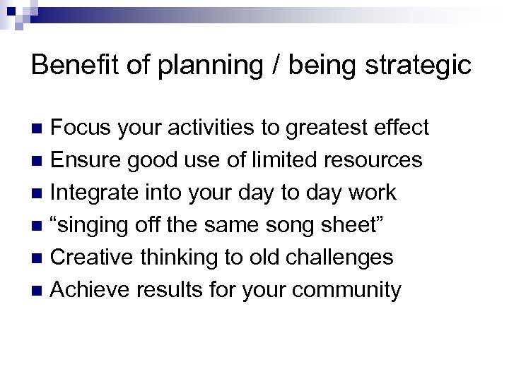 Benefit of planning / being strategic Focus your activities to greatest effect n Ensure good use of limited resources n Integrate into your day to day work n “singing off the same song sheet” n Creative thinking to old challenges n Achieve results for your community n