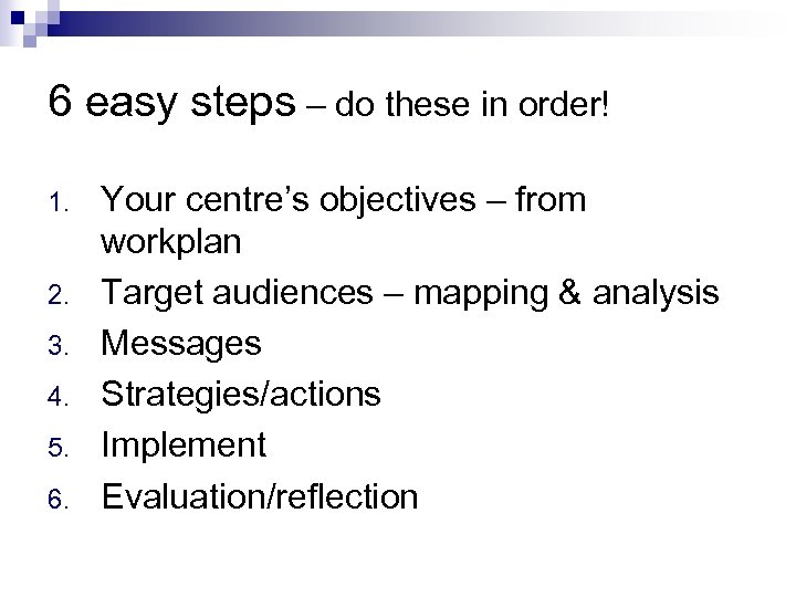 6 easy steps – do these in order! 1. 2. 3. 4. 5. 6. Your centre’s objectives – from workplan Target audiences – mapping & analysis Messages Strategies/actions Implement Evaluation/reflection