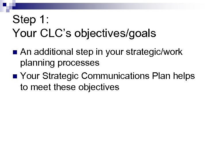 Step 1: Your CLC’s objectives/goals An additional step in your strategic/work planning processes n Your Strategic Communications Plan helps to meet these objectives n