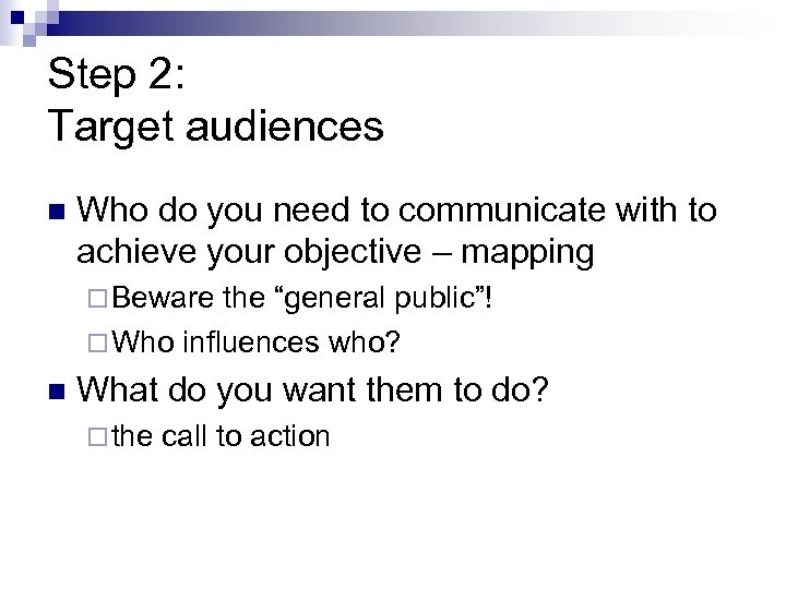 Step 2: Target audiences n Who do you need to communicate with to achieve your objective – mapping ¨ Beware the “general public”! ¨ Who influences who? n What do you want them to do? ¨ the call to action