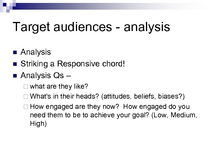 Target audiences - analysis n n n Analysis Striking a Responsive chord! Analysis Qs – ¨ what are they like? ¨ What's in their heads? (attitudes, beliefs, biases? ) ¨ How engaged are they now? How engaged do you need them to be to achieve your goal? (Low, Medium, High)