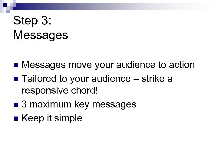 Step 3: Messages move your audience to action n Tailored to your audience – strike a responsive chord! n 3 maximum key messages n Keep it simple n