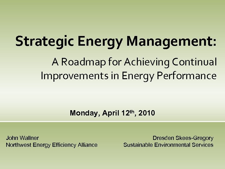 Strategic Energy Management: A Roadmap for Achieving Continual Improvements in Energy Performance Monday, April 12 th, 2010 John Wallner Northwest Energy Efficiency Alliance Dresden Skees-Gregory Sustainable Environmental Services