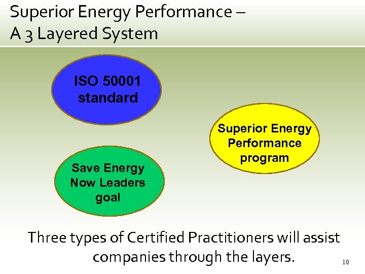 Superior Energy Performance – A 3 Layered System ISO 50001 standard Save Energy Now Leaders goal Superior Energy Performance program Three types of Certified Practitioners will assist companies through the layers. 10