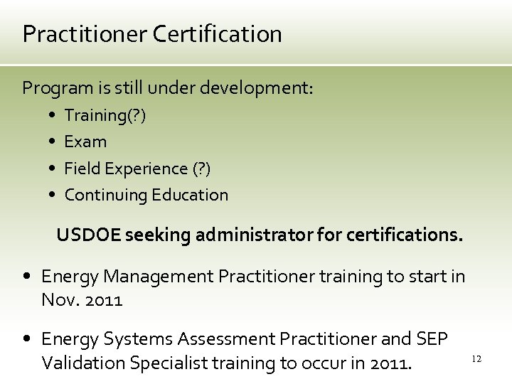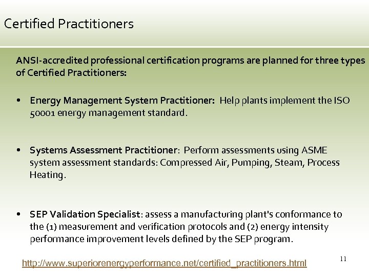 Certified Practitioners ANSI-accredited professional certification programs are planned for three types of Certified Practitioners: • Energy Management System Practitioner: Help plants implement the ISO 50001 energy management standard. • Systems Assessment Practitioner: Perform assessments using ASME system assessment standards: Compressed Air, Pumping, Steam, Process Heating. • SEP Validation Specialist: assess a manufacturing plant's conformance to the (1) measurement and verification protocols and (2) energy intensity performance improvement levels defined by the SEP program. http: //www. superiorenergyperformance. net/certified_practitioners. html 11
