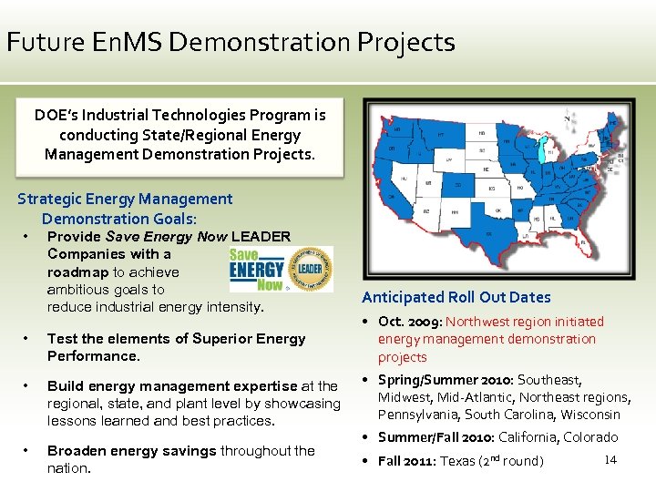 Northwest Energy Management Demo Pilot USDOE and NEEA are hosting a demonstration pilot in the Northwest. • Pilot is testing: • ANSI MSE 2008 & ISO 50001 • USDOE’s Save Energy Now LEADERS program • USDOE’s Superior Energy Performance program • Program involves: • Four companies • Workshops and webinars • Assistance with implementation by “Field Advisor” consultants. • www. nwemdemo. org 13