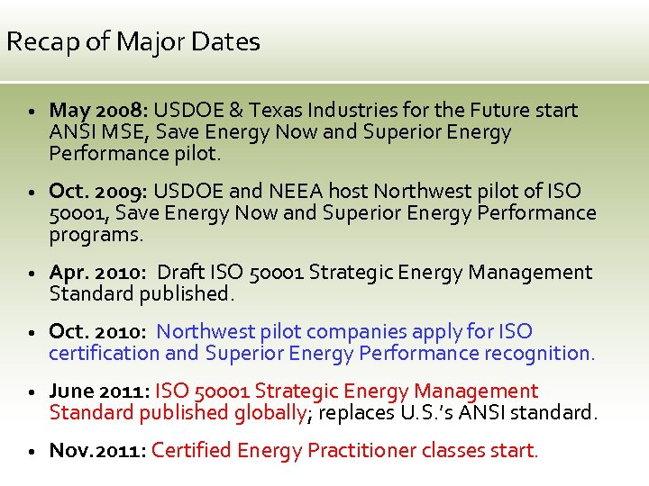 Recap of Major Dates • May 2008: USDOE & Texas Industries for the Future start ANSI MSE, Save Energy Now and Superior Energy Performance pilot. • Oct. 2009: USDOE and NEEA host Northwest pilot of ISO 50001, Save Energy Now and Superior Energy Performance programs. • Apr. 2010: Draft ISO 50001 Strategic Energy Management Standard published. • Oct. 2010: Northwest pilot companies apply for ISO certification and Superior Energy Performance recognition. • June 2011: ISO 50001 Strategic Energy Management Standard published globally; replaces U. S. ’s ANSI standard. • Nov. 2011: Certified Energy Practitioner classes start.