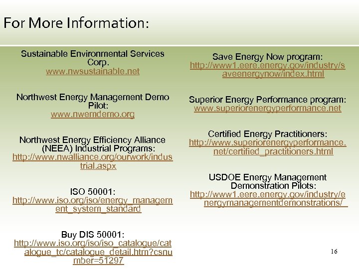 For More Information: Sustainable Environmental Services Corp. www. nwsustainable. net Save Energy Now program: http: //www 1. eere. energy. gov/industry/s aveenergynow/index. html Northwest Energy Management Demo Pilot: www. nwemdemo. org Superior Energy Performance program: www. superiorenergyperformance. net Northwest Energy Efficiency Alliance (NEEA) Industrial Programs: http: //www. nwalliance. org/ourwork/indus trial. aspx ISO 50001: http: //www. iso. org/iso/energy_managem ent_system_standard Buy DIS 50001: http: //www. iso. org/iso_catalogue/cat alogue_tc/catalogue_detail. htm? csnu mber=51297 Certified Energy Practitioners: http: //www. superiorenergyperformance. net/certified_practitioners. html USDOE Energy Management Demonstration Pilots: http: //www 1. eere. energy. gov/industry/e nergymanagementdemonstrations/ 16