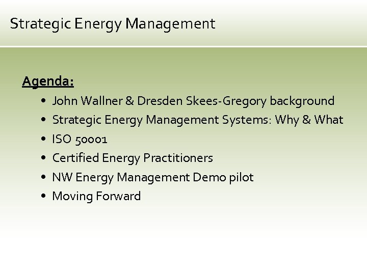 Strategic Energy Management Agenda: • • • John Wallner & Dresden Skees-Gregory background Strategic Energy Management Systems: Why & What ISO 50001 Certified Energy Practitioners NW Energy Management Demo pilot Moving Forward