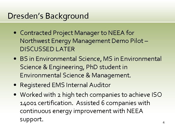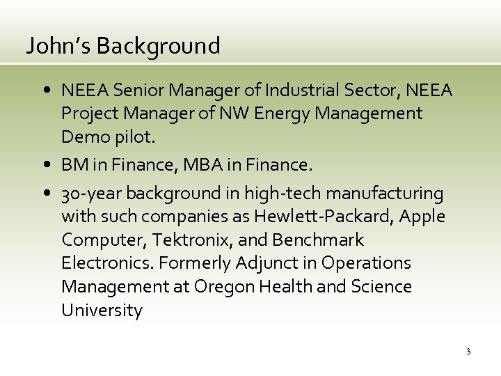 John’s Background • NEEA Senior Manager of Industrial Sector, NEEA Project Manager of NW Energy Management Demo pilot. • BM in Finance, MBA in Finance. • 30 -year background in high-tech manufacturing with such companies as Hewlett-Packard, Apple Computer, Tektronix, and Benchmark Electronics. Formerly Adjunct in Operations Management at Oregon Health and Science University 3