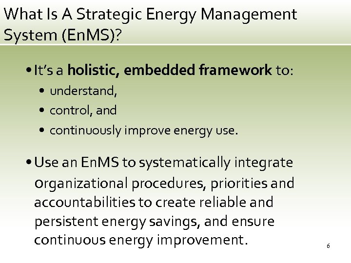 Why Strategic Energy Management • Bolsters a competitive advantage by cutting costs • Tackles complex energy issues • Ensures continuing, persistent focus on energy efficiency and cost control • Enables consistent, persistent, organized, integrated, and embedded energy management 5