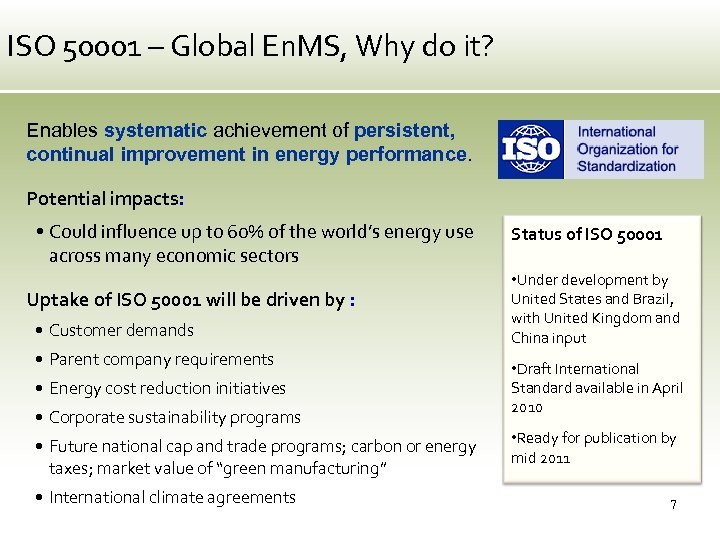 What Is A Strategic Energy Management System (En. MS)? • It’s a holistic, embedded framework to: • understand, • control, and • continuously improve energy use. • Use an En. MS to systematically integrate organizational procedures, priorities and accountabilities to create reliable and persistent energy savings, and ensure continuous energy improvement. 6