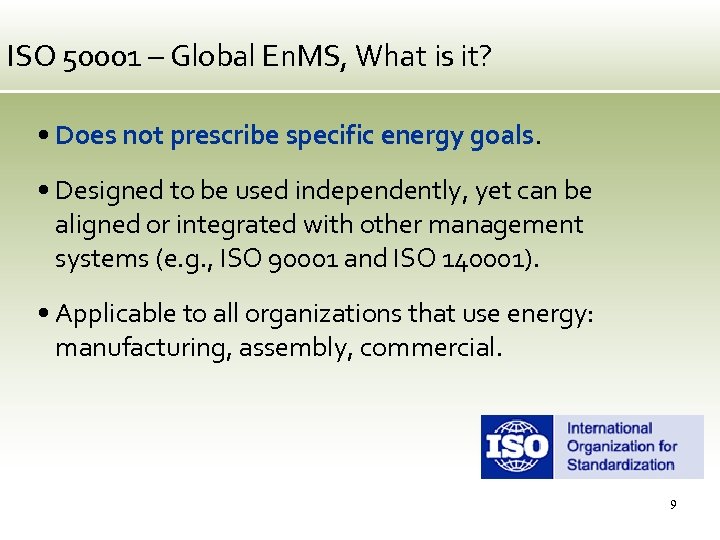 ISO 50001 – Global En. MS, What is it? • Establishes management processes on energy supply and consumption. • Includes key elements developed over 60 years to deal with holes/problems that commonly arise in any business system: • Policy & top management support • Defined roles and responsibilities • Energy data tracking & KPI analysis • Energy Assessments • Establishment, mgmt. & tracking of energy reduction programs • Control of energy using processes, equipment, etc. • Documentation & records control • Internal auditing of processes & programs • Corrective & preventative actions • Regular management review 8