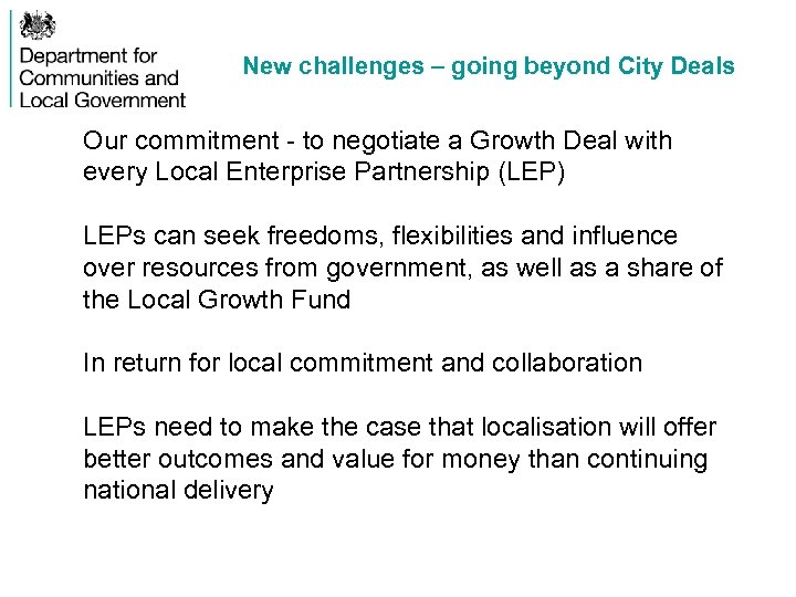 New challenges – going beyond City Deals Our commitment - to negotiate a Growth Deal with every Local Enterprise Partnership (LEP) LEPs can seek freedoms, flexibilities and influence over resources from government, as well as a share of the Local Growth Fund In return for local commitment and collaboration LEPs need to make the case that localisation will offer better outcomes and value for money than continuing national delivery