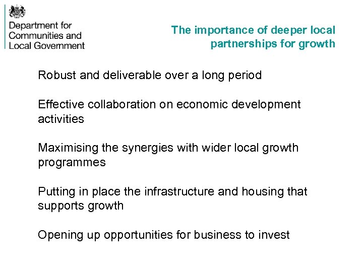 The importance of deeper local partnerships for growth Robust and deliverable over a long period Effective collaboration on economic development activities Maximising the synergies with wider local growth programmes Putting in place the infrastructure and housing that supports growth Opening up opportunities for business to invest