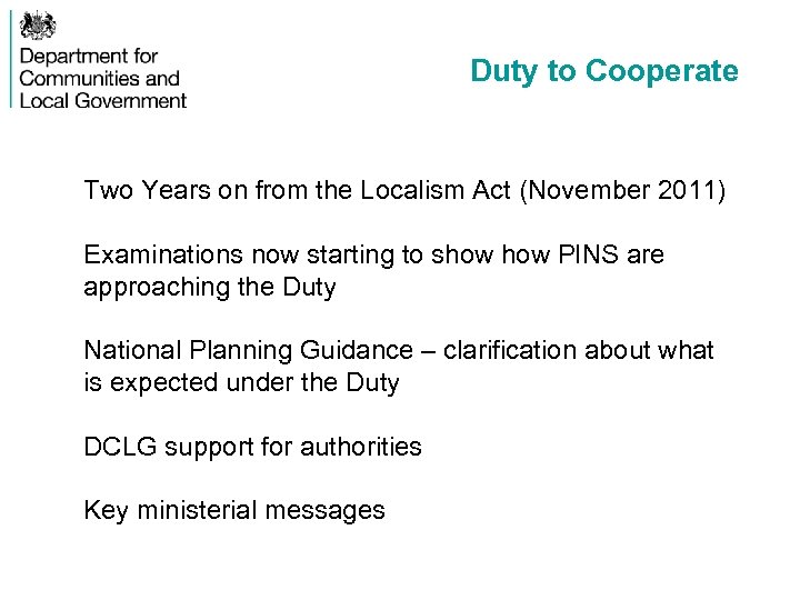 Duty to Cooperate Two Years on from the Localism Act (November 2011) Examinations now starting to show PINS are approaching the Duty National Planning Guidance – clarification about what is expected under the Duty DCLG support for authorities Key ministerial messages