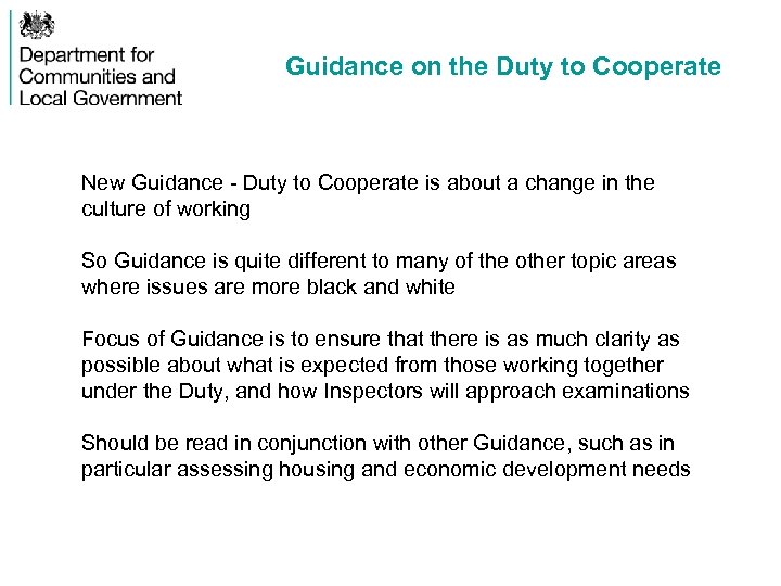 Guidance on the Duty to Cooperate New Guidance - Duty to Cooperate is about a change in the culture of working So Guidance is quite different to many of the other topic areas where issues are more black and white Focus of Guidance is to ensure that there is as much clarity as possible about what is expected from those working together under the Duty, and how Inspectors will approach examinations Should be read in conjunction with other Guidance, such as in particular assessing housing and economic development needs