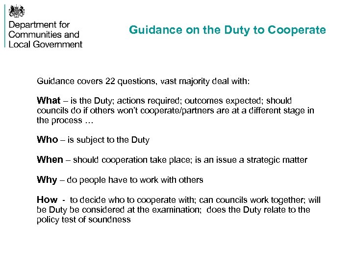 Guidance on the Duty to Cooperate Guidance covers 22 questions, vast majority deal with: What – is the Duty; actions required; outcomes expected; should councils do if others won’t cooperate/partners are at a different stage in the process … Who – is subject to the Duty When – should cooperation take place; is an issue a strategic matter Why – do people have to work with others How - to decide who to cooperate with; can councils work together; will be Duty be considered at the examination; does the Duty relate to the policy test of soundness
