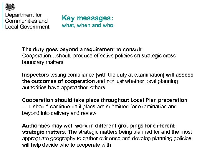 Key messages: what, when and who The duty goes beyond a requirement to consult. Cooperation…should produce effective policies on strategic cross boundary matters Inspectors testing compliance [with the duty at examination] will assess the outcomes of cooperation and not just whether local planning authorities have approached others Cooperation should take place throughout Local Plan preparation …it should continue until plans are submitted for examination and beyond into delivery and review Authorities may well work in different groupings for different strategic matters. The strategic matters being planned for and the most appropriate geography to gather evidence and develop planning policies will help decide who to cooperate with