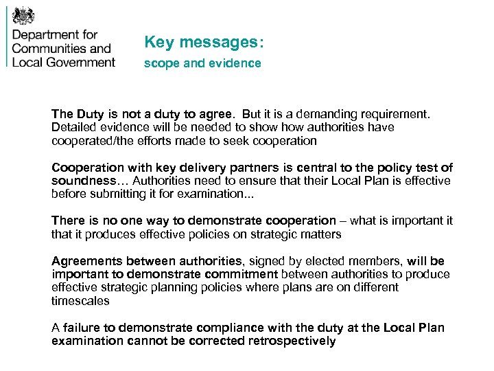 Key messages: scope and evidence The Duty is not a duty to agree. But it is a demanding requirement. Detailed evidence will be needed to show authorities have cooperated/the efforts made to seek cooperation Cooperation with key delivery partners is central to the policy test of soundness… Authorities need to ensure that their Local Plan is effective before submitting it for examination. . . There is no one way to demonstrate cooperation – what is important it that it produces effective policies on strategic matters Agreements between authorities, signed by elected members, will be important to demonstrate commitment between authorities to produce effective strategic planning policies where plans are on different timescales A failure to demonstrate compliance with the duty at the Local Plan examination cannot be corrected retrospectively