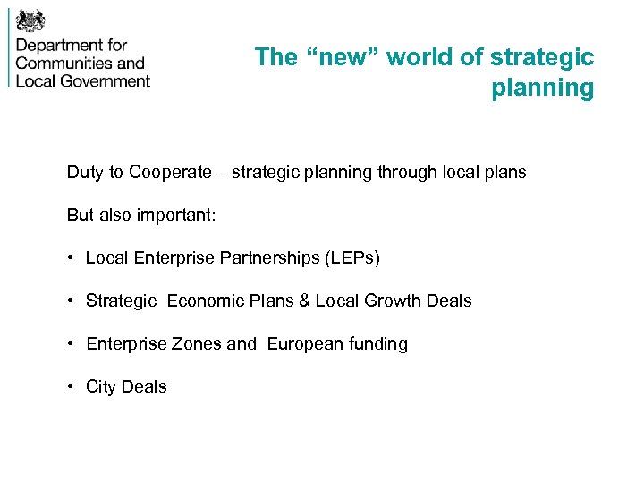 The “new” world of strategic planning Duty to Cooperate – strategic planning through local plans But also important: • Local Enterprise Partnerships (LEPs) • Strategic Economic Plans & Local Growth Deals • Enterprise Zones and European funding • City Deals