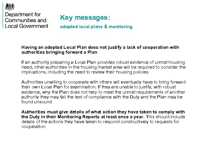 Key messages: adopted local plans & monitoring Having an adopted Local Plan does not justify a lack of cooperation with authorities bringing forward a Plan If an authority preparing a Local Plan provides robust evidence of unmet housing need, other authorities in the housing market area will be required to consider the implications, including the need to review their housing policies Authorities unwilling to cooperate with others will eventually have to bring forward their own Local Plan for examination. If they are unable to justify, with robust evidence, why the Plan does not help to meet the unmet requirements of another authority they may fail the test of compliance with the Duty and the Plan may be found unsound Authorities must give details of what action they have taken to comply with the Duty in their Monitoring Reports at least once a year. This should include details of the actions they have taken to respond constructively to requests for cooperation