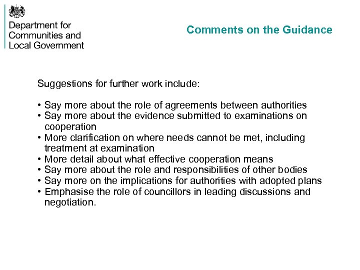 Comments on the Guidance Suggestions for further work include: • Say more about the role of agreements between authorities • Say more about the evidence submitted to examinations on cooperation • More clarification on where needs cannot be met, including treatment at examination • More detail about what effective cooperation means • Say more about the role and responsibilities of other bodies • Say more on the implications for authorities with adopted plans • Emphasise the role of councillors in leading discussions and negotiation.