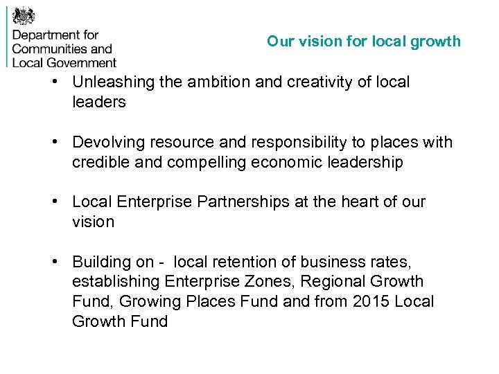 Our vision for local growth • Unleashing the ambition and creativity of local leaders • Devolving resource and responsibility to places with credible and compelling economic leadership • Local Enterprise Partnerships at the heart of our vision • Building on - local retention of business rates, establishing Enterprise Zones, Regional Growth Fund, Growing Places Fund and from 2015 Local Growth Fund