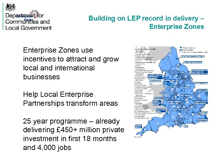 Building on LEP record in delivery – Enterprise Zones use incentives to attract and grow local and international businesses Help Local Enterprise Partnerships transform areas 25 year programme – already delivering £ 450+ million private investment in first 18 months and 4, 000 jobs